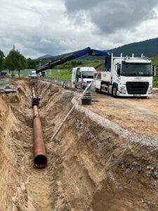 Durch die Fertigstellung „Lückenschluss B3 neu“ muss die Hauptwasserleitung für Sinzheim in ein Stahlschutz Schutzrohr umverlegt werden, da der Erdwall (rechts im Bild) durch Straßenumgestaltung über das Schutzrohr verlegt wird. Aufgrund von Umschlussarbeiten der neuverlegten Leitung auf den Bestand kommt es zur Versorgungsunterbrechung vom 8. August 2024 von 20:00 Uhr bis voraussichtlich 9. August 2024 02:00Uhr. Betroffen sind Schiftung, Leiberstung, Halberstung, Müllhofen und der Rasthof Bühl.